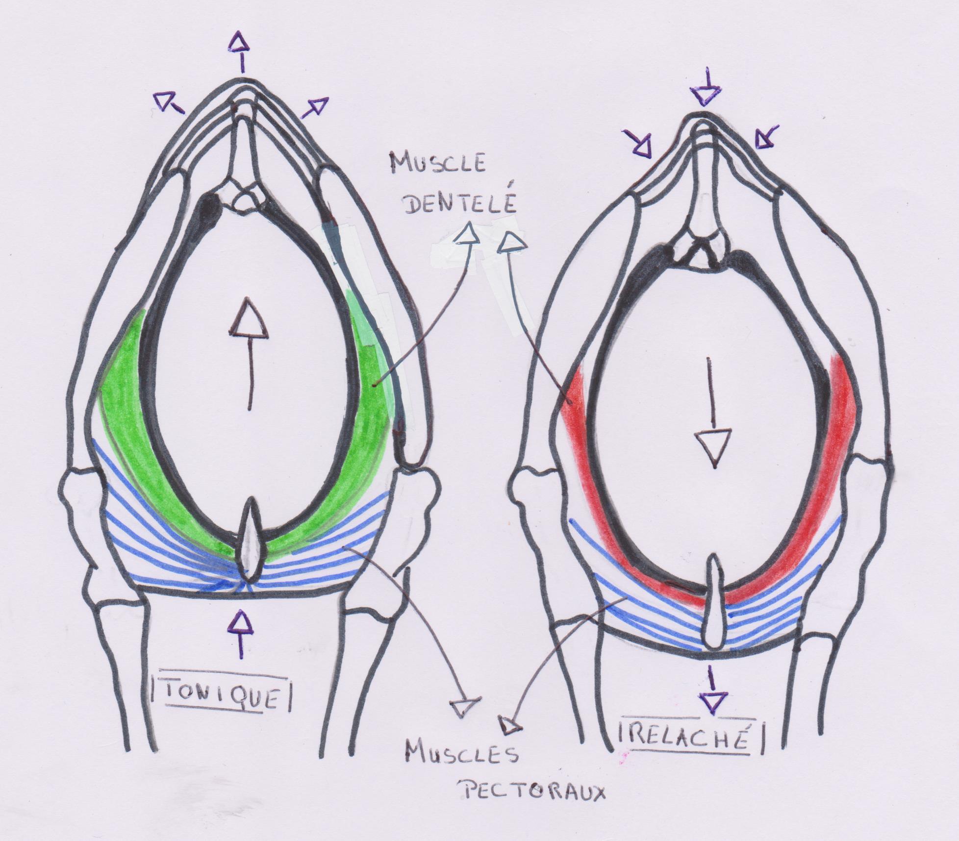 👉 Sa cage thoracique est suspendue entre les deux antérieurs (les épaules) uniquement par des muscles et des fascias.